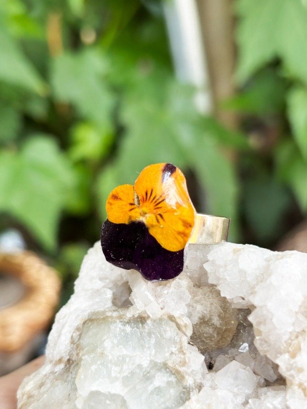 Anillo de metal con flor de Viola/Pensamiento encapsulada en resina.