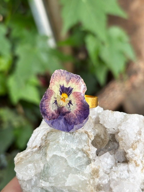 Anillo de metal con flor de Viola/Pensamiento encapsulada en resina.