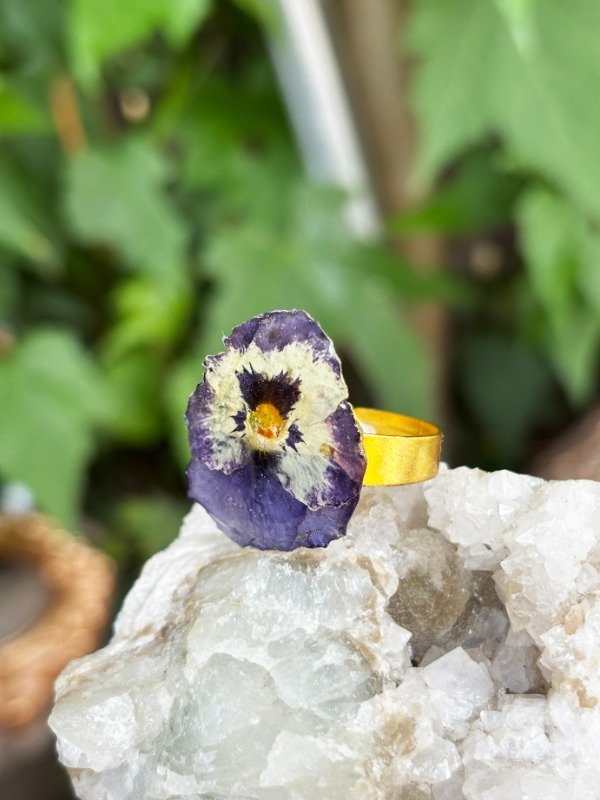 Anillo de metal con flor de Viola/Pensamiento encapsulada en resina.