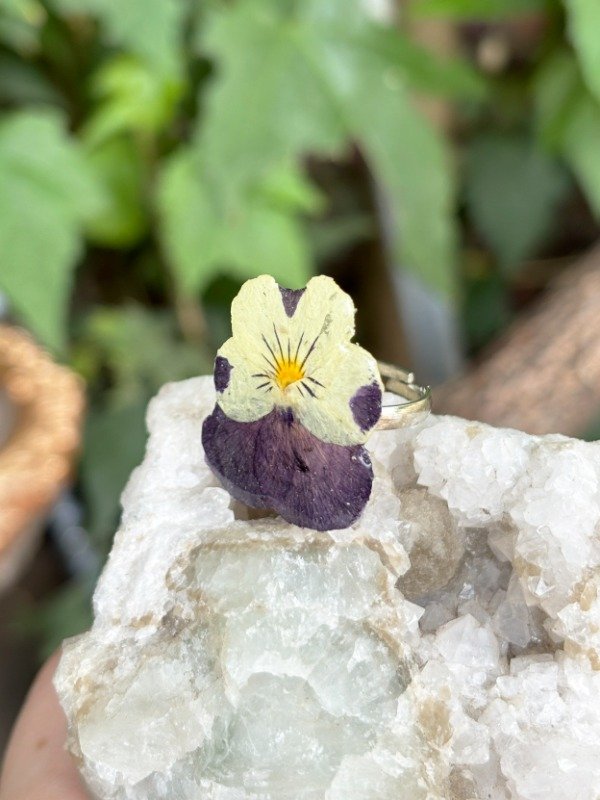Anillo de metal con flor de Viola/Pensamiento encapsulada en resina.