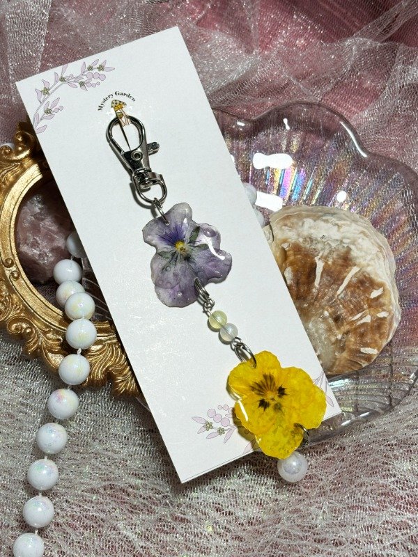 Charm/llavero hecho con flores de Pensamiento Reales.
