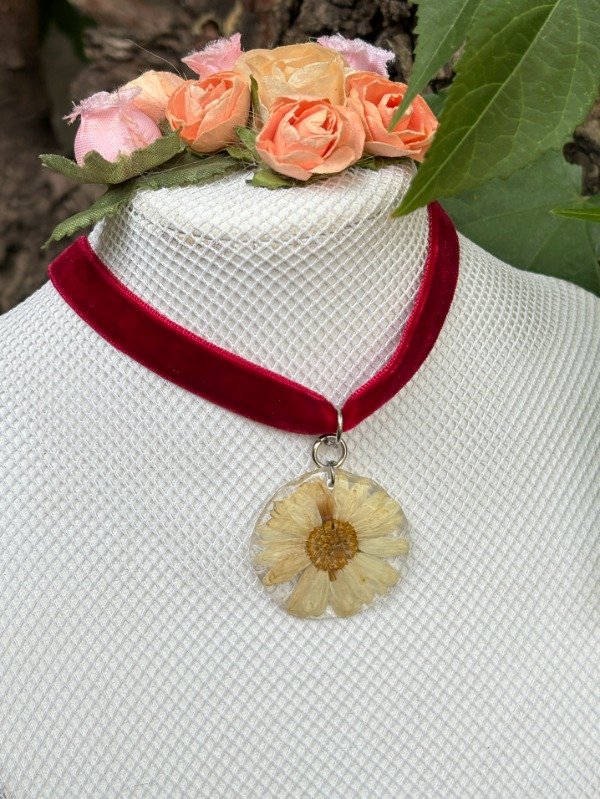 Collar estilo gargantilla con cinta de terciopelo y ganchito con cadena. Dije de flores reales. Se puede intercambiar el color de la cinta, solo aclararlo en notas del pedido. Colores disponibles: violeta, verde musgo, negro, gris, rosa pastel, rojo y azul eléctrico.