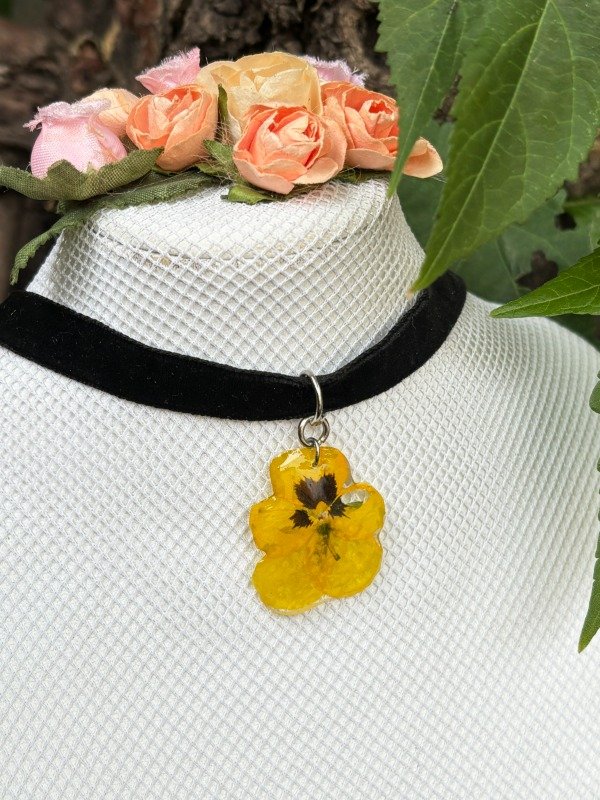 Collar estilo gargantilla con cinta de terciopelo y ganchito con cadena. Dije de flores reales. Se puede intercambiar el color de la cinta, solo aclararlo en notas del pedido. Colores disponibles: violeta, verde musgo, negro, gris, rosa pastel, rojo y azul eléctrico.