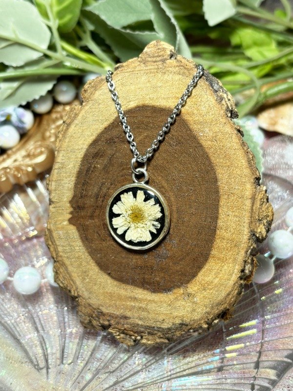 Collar de acero con dije de resina y flor de Margarita. Medidas del dije: 2x2 cm