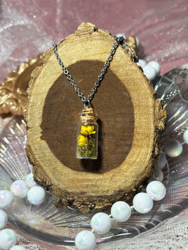 Collar de acero con dije de botellita y ramito de flores amarillas.