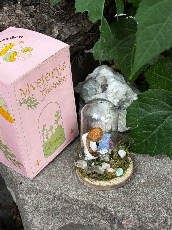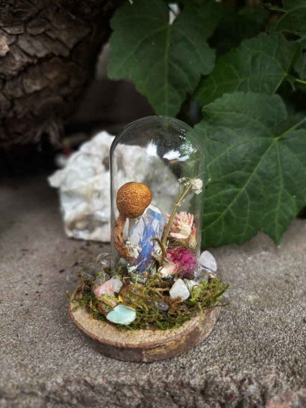 Bioma de cristal con flores, cuarzos, piedras minerales y hongos REALES preservados. Medidas: Medidas: 5x8 cm. Viene con su propio packaging.