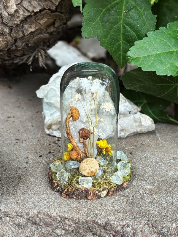 Bioma de cristal con flores, cuarzos, piedras minerales y hongos REALES preservados. Medidas: 5x8 cm. Viene con su propio packaging.