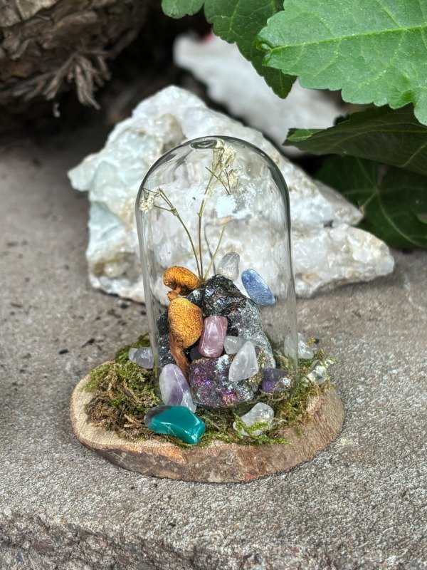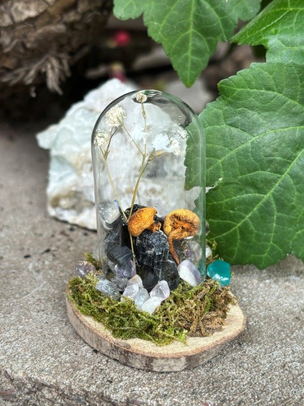 Bioma de cristal con flores, cuarzos, piedras minerales y hongos REALES preservados. Medidas: Medidas: 5x8 cm. Viene con su propio packaging.