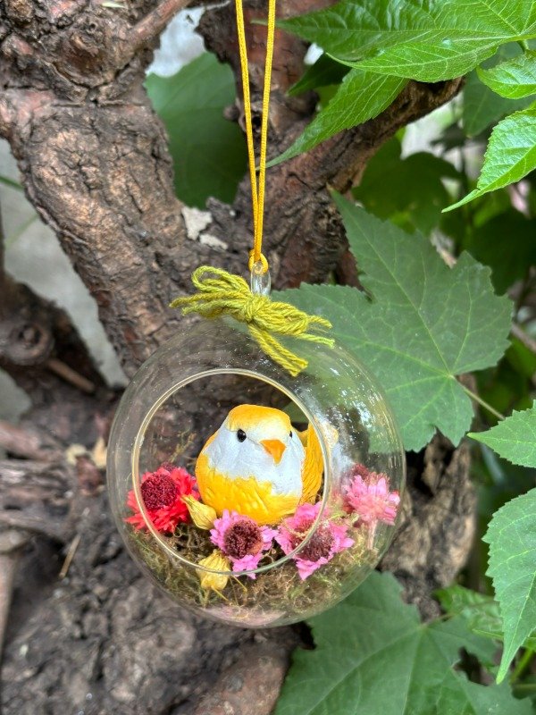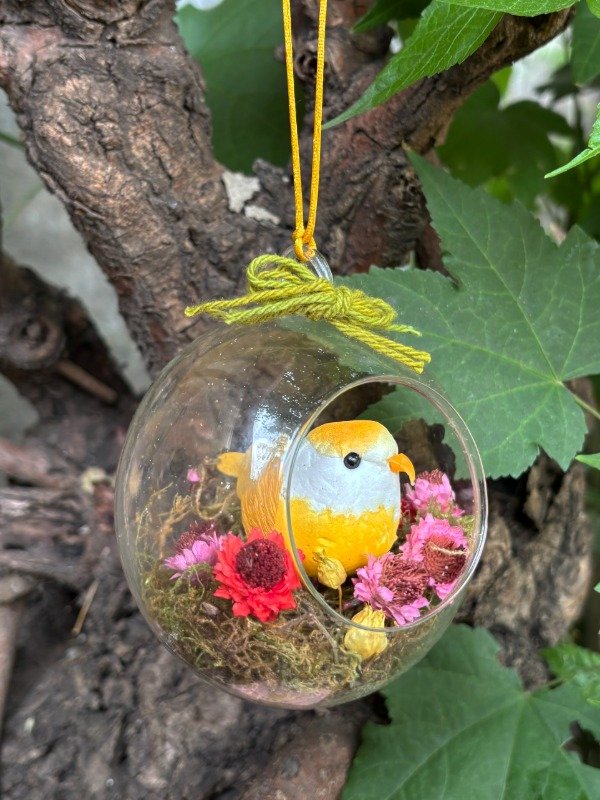 Bioma con pajarito para colgar. Esfera de cristal. Medidas: 9x9 cm