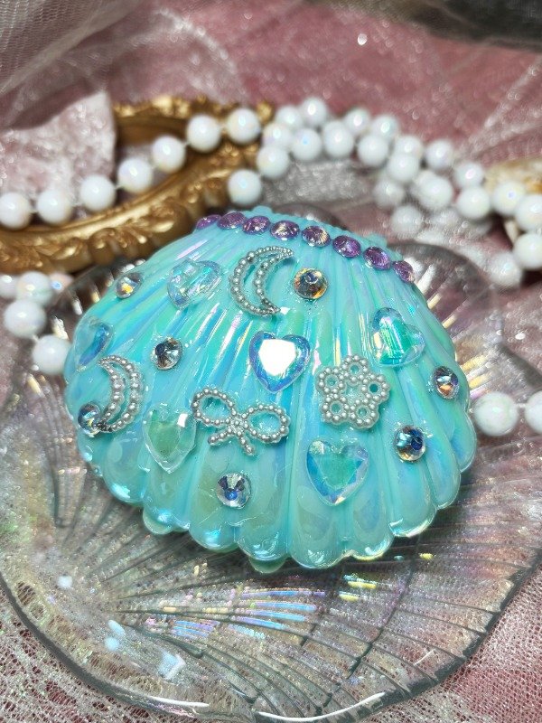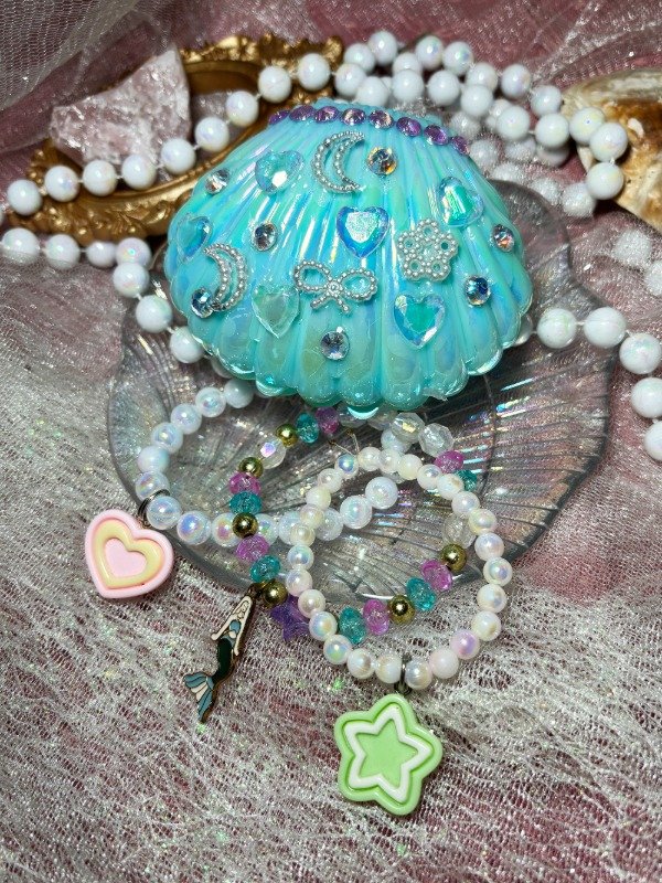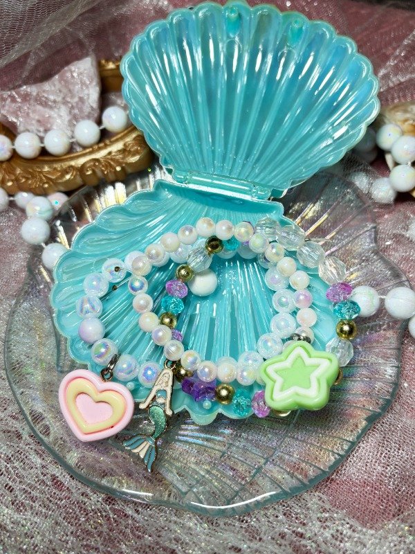 Alajero en forma de caracola con perla en su interior más 3 pulseras para infantes. Es de plástico y se le puede dar cualquier uso.