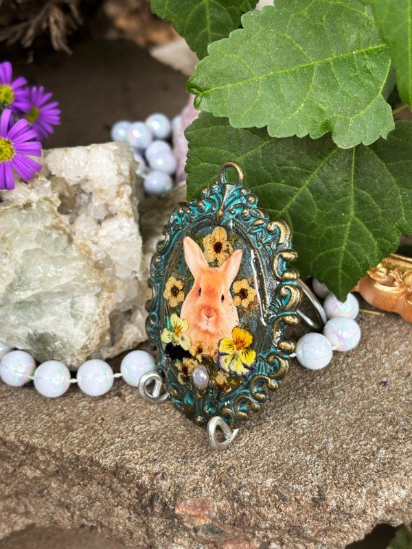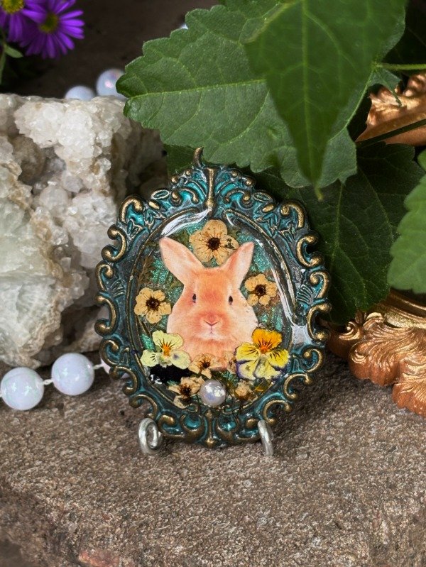 Cuadrito de metal con flores reales y conejito. Hecho con resina. Viene con base para apoyar y llenar cualquier rincón de magia, también posee un orificio para poder ser colgado. Medidas: 5x8 cm