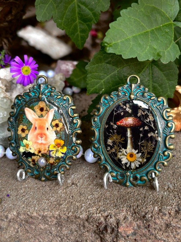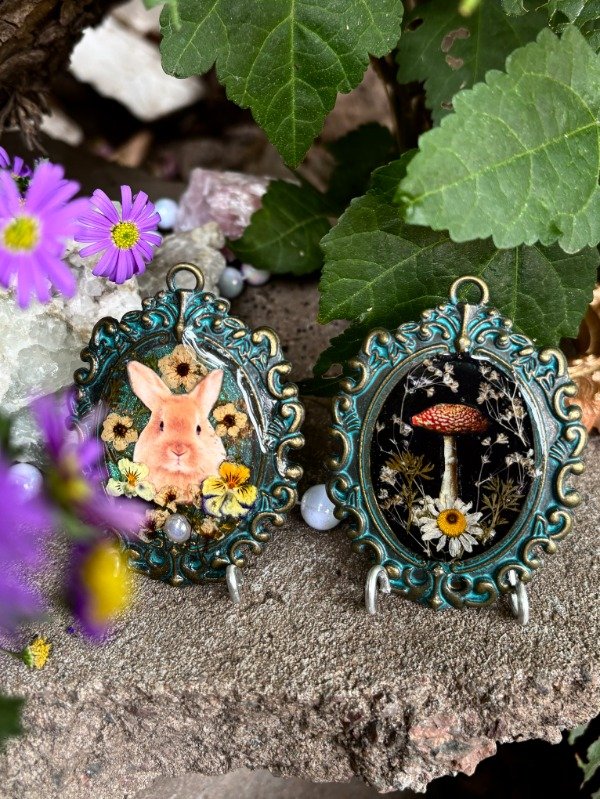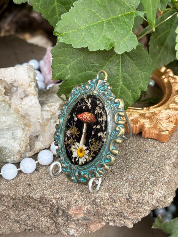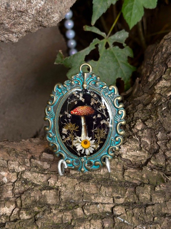 Cuadrito de metal con flores reales y honguito. Hecho con resina. Viene con base para apoyar y llenar cualquier rincón de magia, también posee un orificio para poder ser colgado. Medidas: 5x8 cm